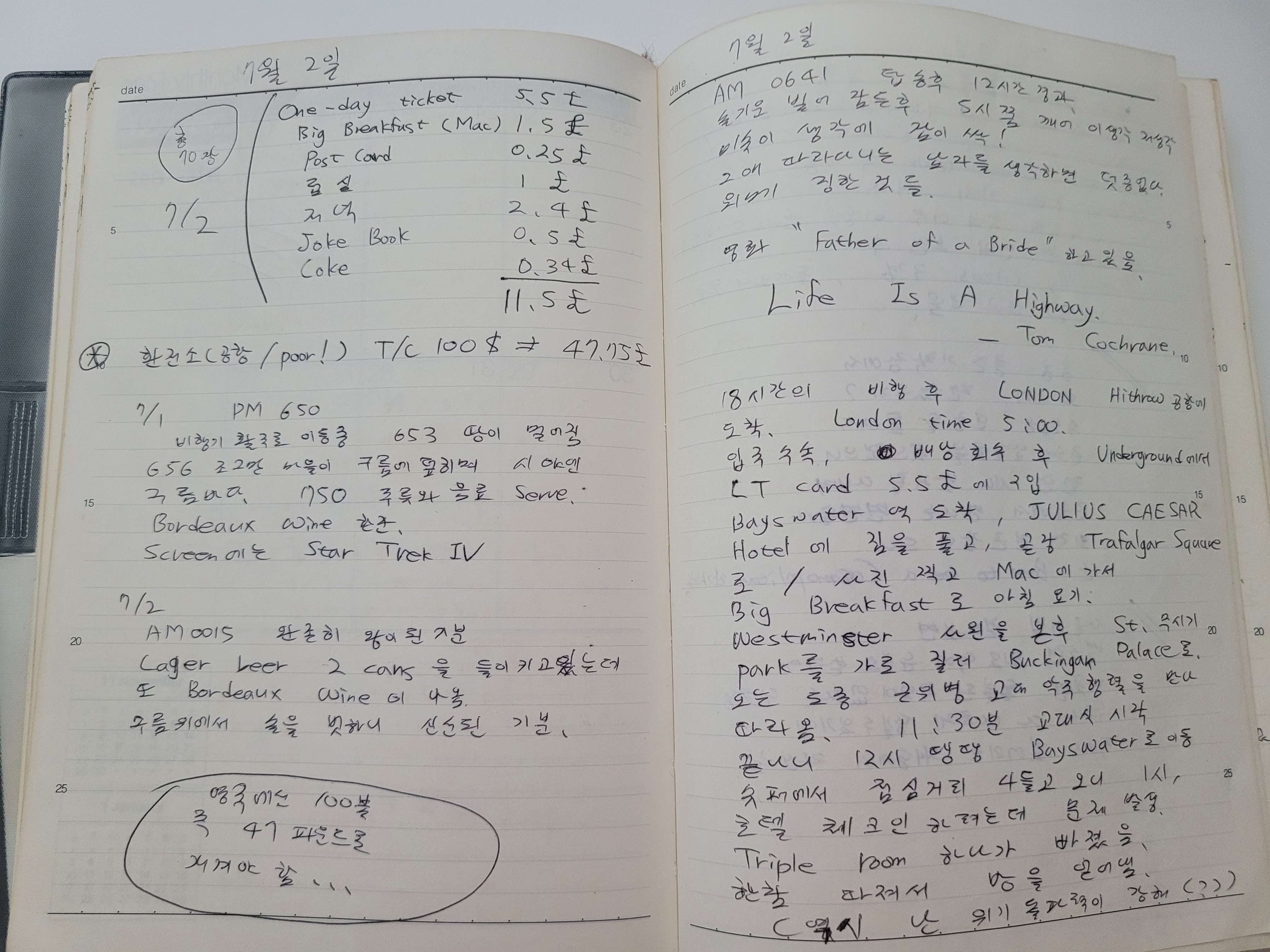 아, 일기를 보다 그 때가 떠오르네요. 여행사에서 런던 도착 첫 날 1박이 포함된 상품을 팔았고 같은 비행기로 이동한 멤버들이랑 숙소에 체크인하러 갔더니 예약에 혼선이 있어 방이 하나 부족했어요. 방을 배정받지 못한 분이 영어를 할 줄 몰라 우왕좌왕... 1992년에는 영어 회화를 공부한 사람이 드물었어요. 그때 제가 직원이랑 열심히 싸워서 방을 쟁취해냈지요. ^^ 영어 공부한 보람을 크게 느낀 순간인데, 문제는 이후 저는 피리부는 사나이가 되어버렸어요. 같이 온 일행들이 다들 나만 졸졸 따라 다녔어요. 내가 놀러 온 건가, 여기 사람들 통역 가이드 해주러 온 건가, 헷갈릴 지경... ^^