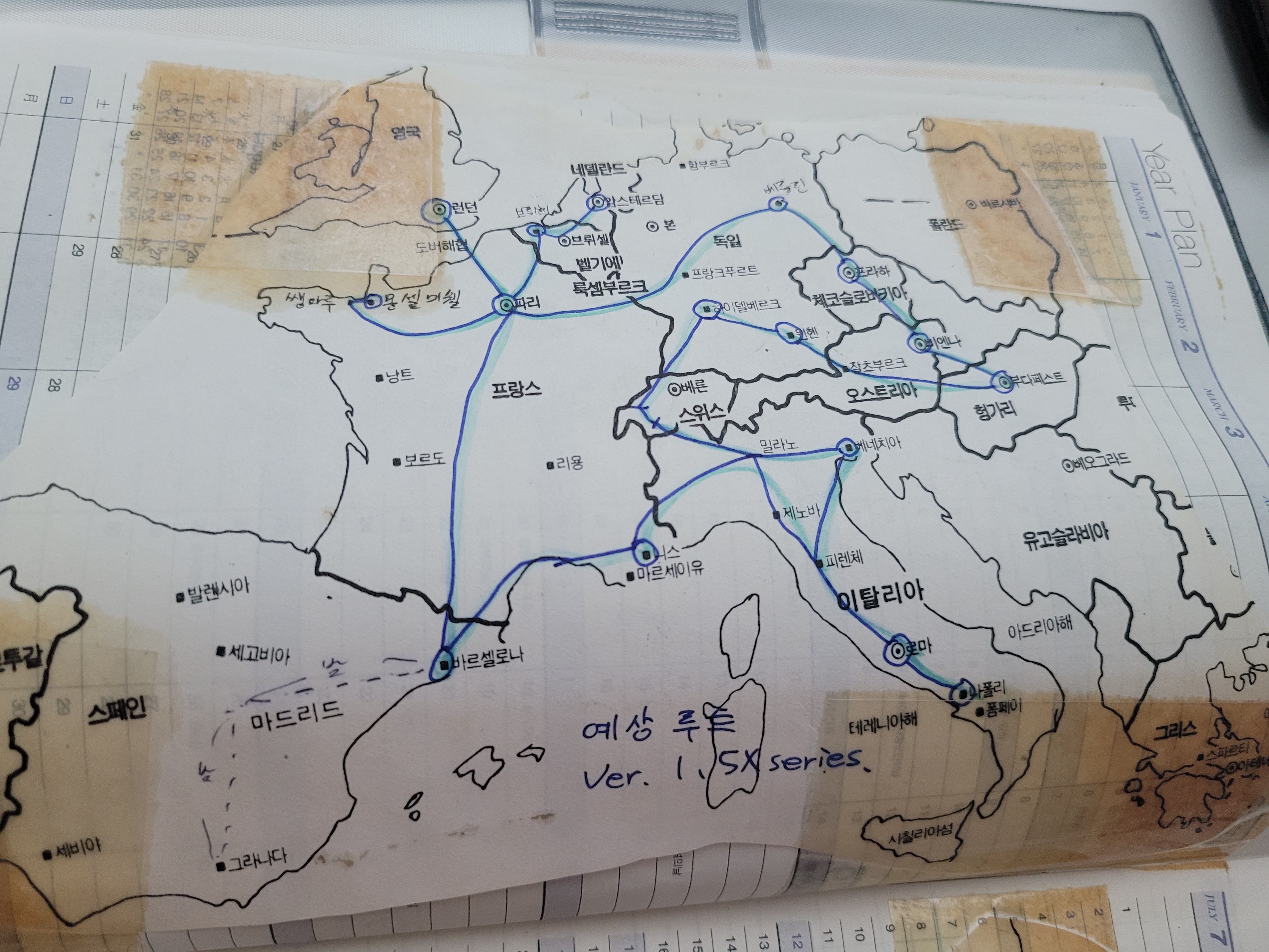 다이어리 첫 장에는 이렇게 예상 루트가 나와있네요. 구글 지도가 없던 시절, 이렇게 경로를 표시했어요.