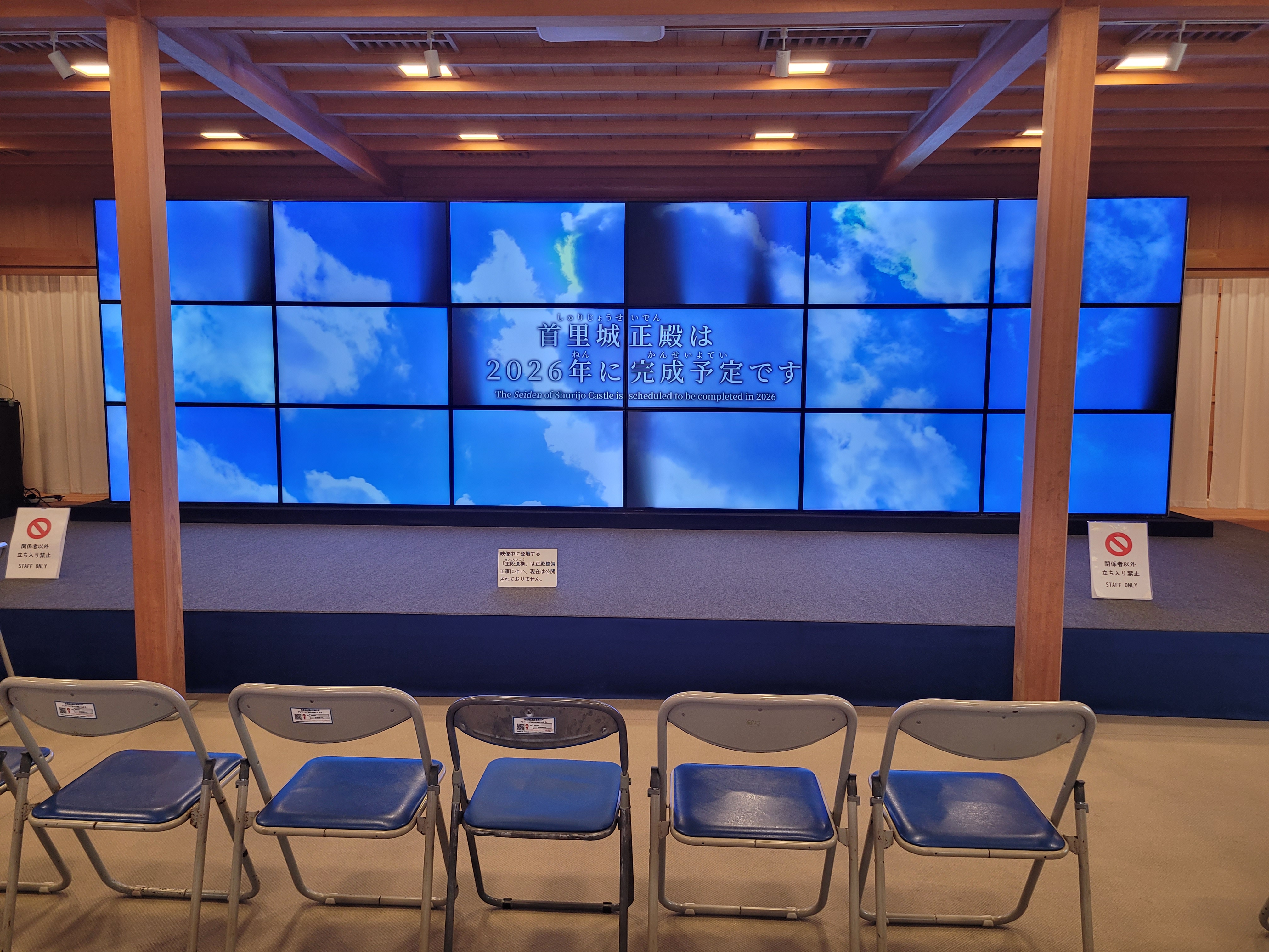 영상관에서 자료 화면을 통해 예전의 모습과 복원 과정을 살펴볼 수 있습니다. 슈리성 입장요금은 어른 400엔, 고교생 300엔인데요. 모노레일 패스 소지자는 할인을 적용해 320엔에 들어갑니다. 모노레일 1일 패스, 여러모로 이득이에요.